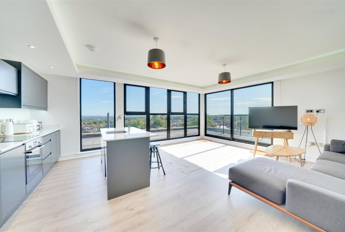 A stylish two-bedroom, two-bathroom top-floor apartment with panoramic views across London’s skyline.