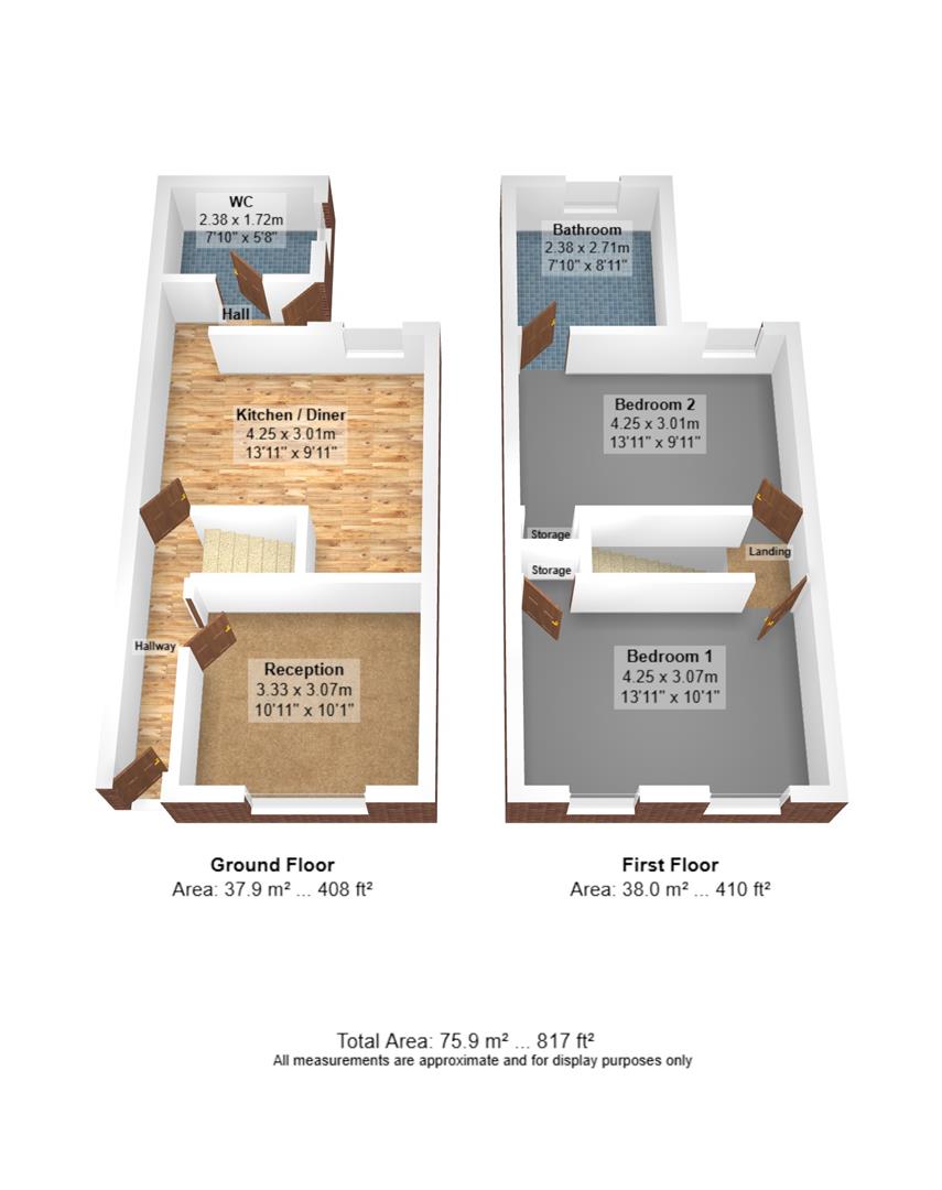The accommodation comprises a front reception room, a kitchen/diner to the rear, and the benefit of a downstairs WC. Upstairs are two bedrooms, with the bathroom accessed via the second bedroom — a layout commonly found in properties of this style and offering scope for reconfiguration as part of any improvement works.